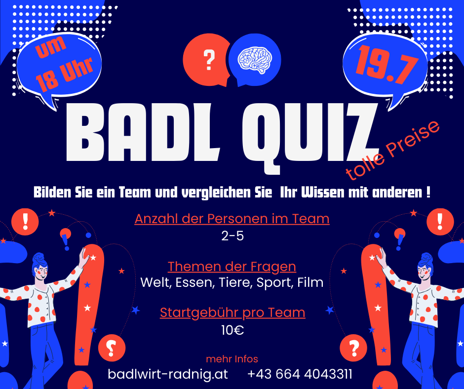 Wir freuen uns schon auf den nächsten Samstag (19.7) und speziell auf das Badl-Quiz, Infos zu diesem Abend gibt es bald auf unserer Website.
