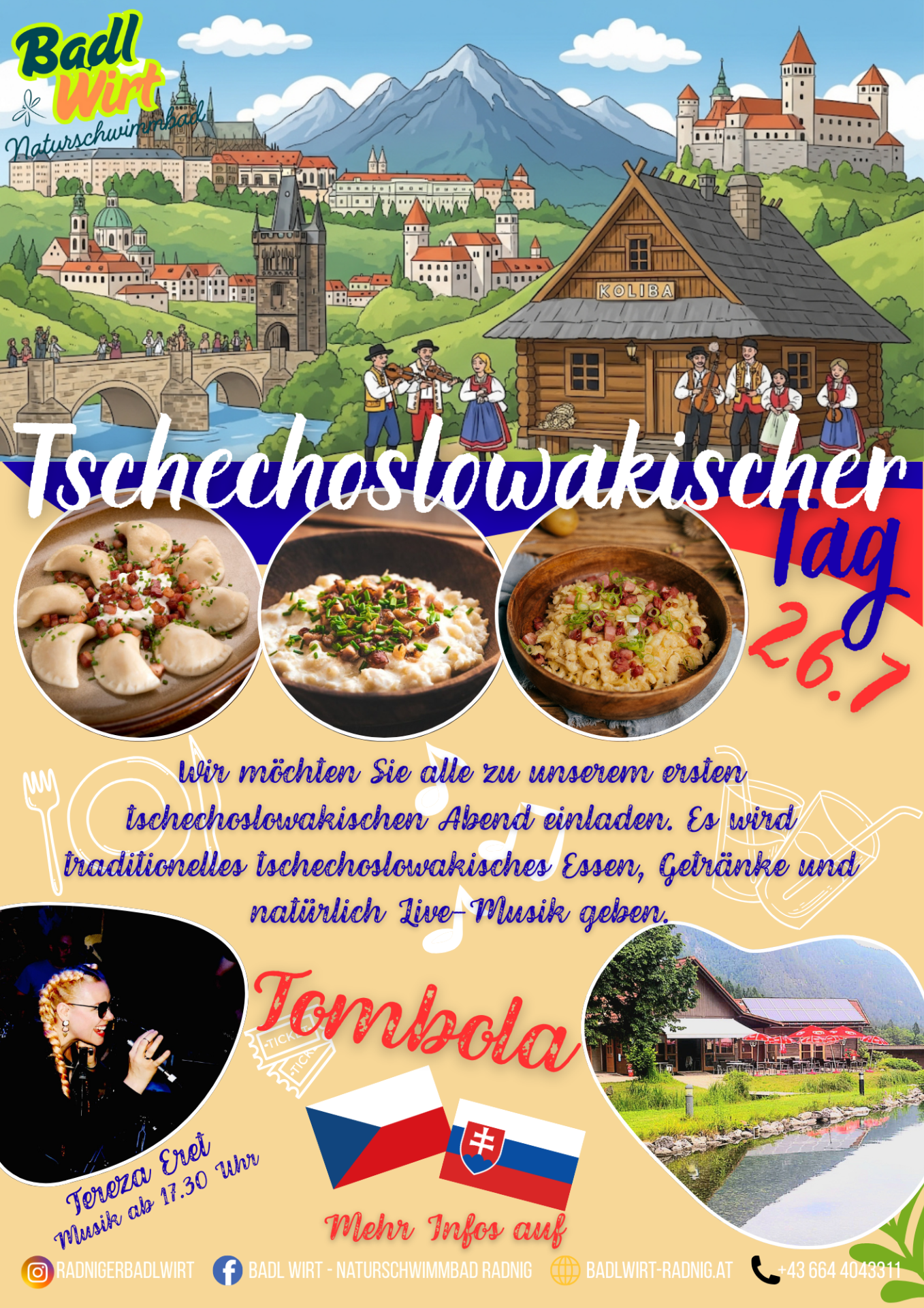 Wir möchten Sie alle zu unserem ersten tschechoslowakischen Abend einladen. Es erwarten Sie hausgemachte, traditionelle tschechoslowakische Speisen, Getränke und natürlich Live-Musik, gespielt von unserer Freundin Tereza Eret, die sogar aus Prag anreist.