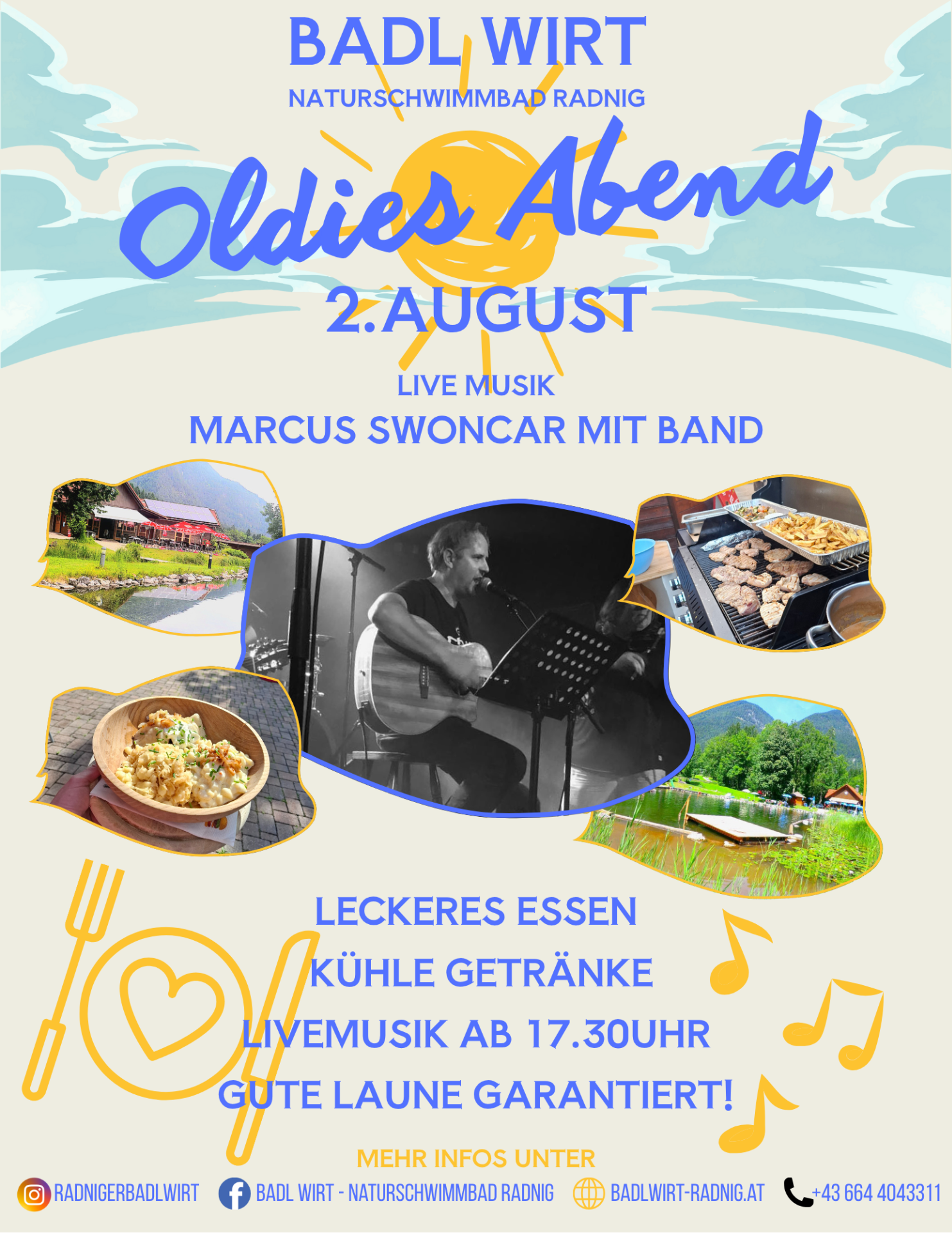Kommen Sie und entspannen Sie sich im Schoß der Natur bei gutem Essen und Musik. Unser nächster Themenabend mit Oldies-Musik von Markus Swoncar und seiner Band und natürlich wie immer tollem Essen, bei dem Sie die Gerichte vom Grill nicht vermissen werden, aber auch Ihre Lieblingsrippchen und für einen großen Erfolg auch einige der tschechoslowakischen Spezialitäten.