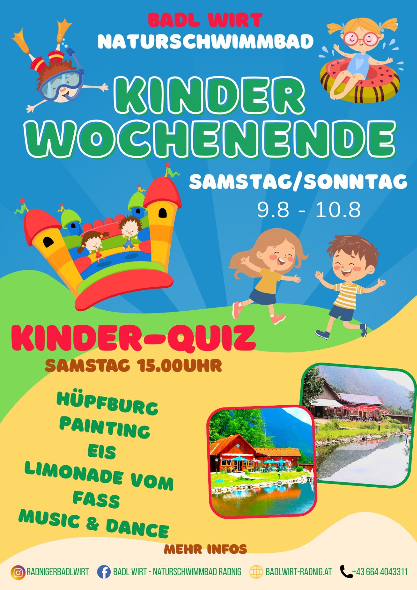 Die Veranstaltung, auf die wir uns freuen, ist da. Wie Sie sicher alle mitbekommen haben, wird es am Samstag ein Kinderquiz geben. Aber wir haben beschlossen, diese Veranstaltung zu verbessern und sie auf das ganze Wochenende auszudehnen! Während des gesamten Wochenendes gibt es eine Hüpfburg, Schwimmen, Gesichtsbemalung, Kindertattoos, Eis, Musik, gutes Essen und natürlich ein Kinderquiz mit tollen Preisen, das am Samstag, den 9.8. um 15 Uhr stattfinden wird.