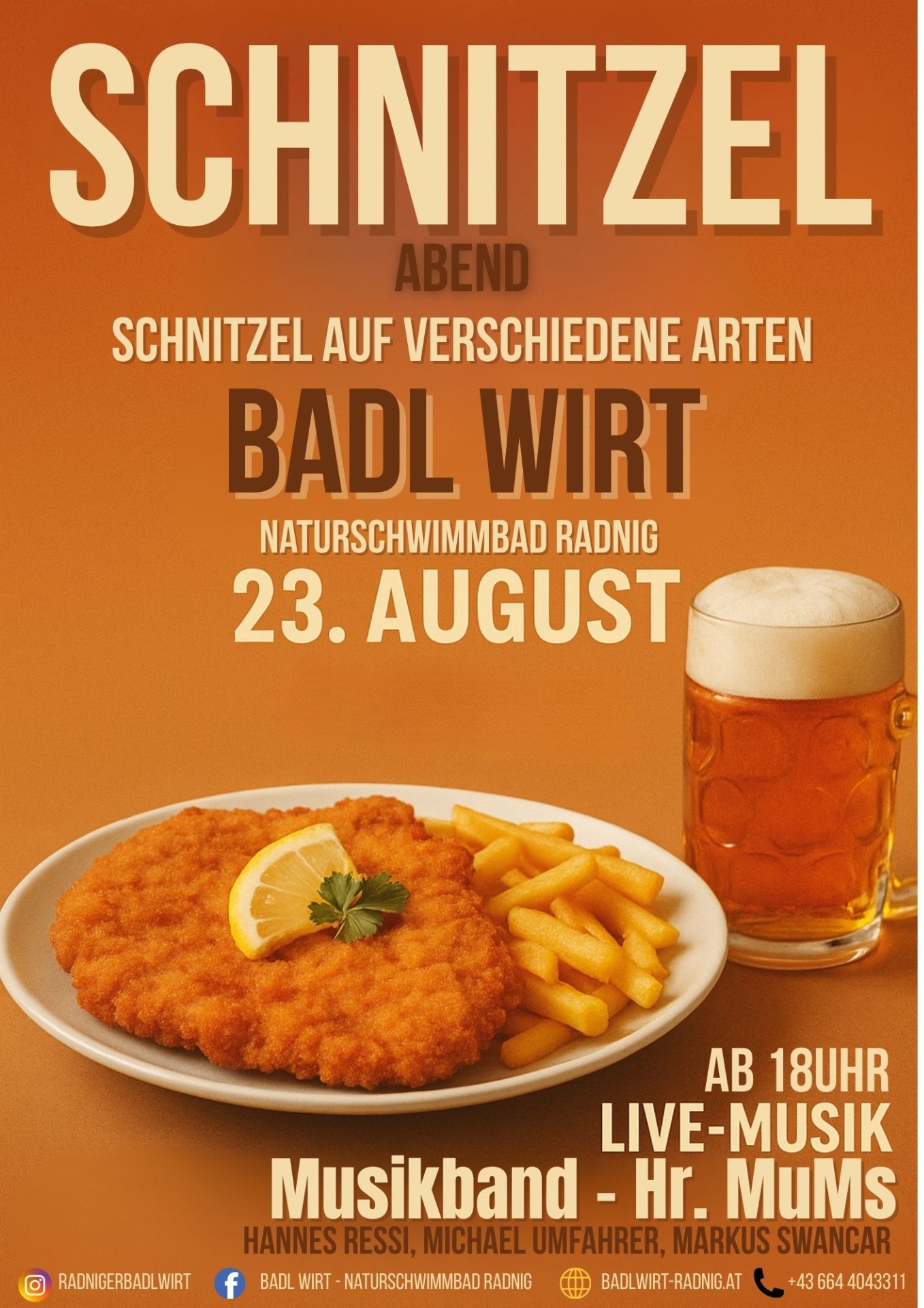 Wir laden Sie herzlich zu unserem Schnitzelabend ein. Kommen Sie und genießen Sie Schnitzel in verschiedenen Variationen, natürlich mit Live-Musik der Musikgruppe Hr. MuMs